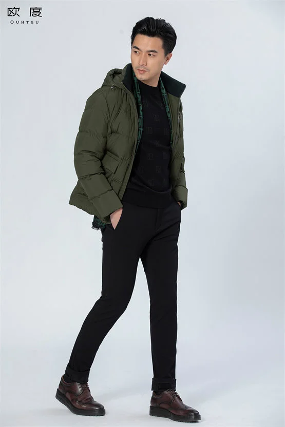 欧度这款松花鹅绒羽绒服,植物绿色调舒适性强,打破了黑色的厚重感。选用鹅绒绒丝细腻均匀,轻盈保暖,有效应对湿冷天气的同时毫无压迫感。外观设计增加工装风大贴袋元素,简洁实用。内搭高品质雪呢绒针织衫,透气舒适,经过剪花工艺特殊织法组合形成凹凸图案,细节独到奢感十足。