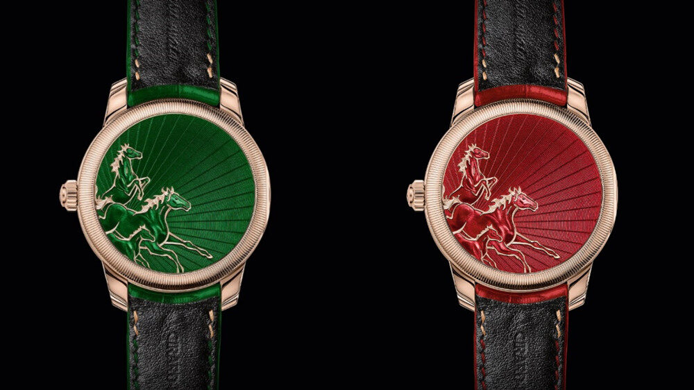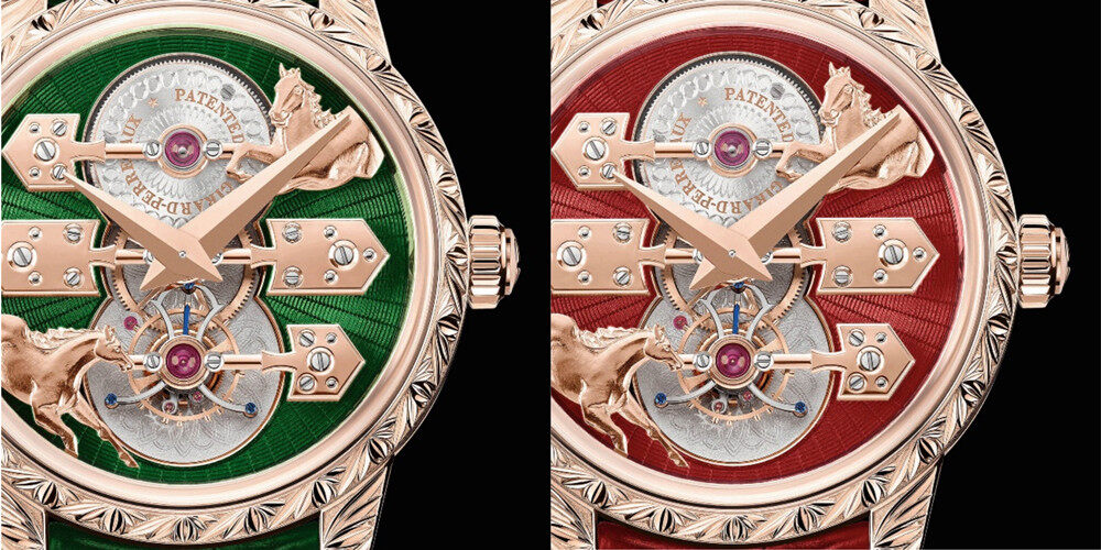 La Esmeralda是GP芝柏表专为1889年世界博览会打造的知名获奖怀表。作为传奇杰作,该款怀表融合了高精密度与丰富艺术工艺。2021年,GP芝柏表诞辰230周年之际,品牌重磅推出 La Esmeralda陀飞轮腕表“神秘骏马”(A Secret),2022年,品牌再度推出了绿色和红色新款。GP芝柏表变内藏于外露——将初款怀表底盖上雕刻的骏马向上移到了瞩目的中心位置,两匹手工雕刻的奔腾骏马分别构成了发条盒桥板和陀飞轮桥板的右端和左端。玫瑰金表壳完全由手工雕刻,致敬弗里茨·昆德尔特的精湛手工艺 以及拉绍德封当今手工匠人的专注精神与高超手艺。表圈、表壳侧面、表耳和表扣均雕刻精致的叶子图案。底盖周边饰有凹槽纹路。此外神秘底盖的内侧和外侧均带有雕刻图案。