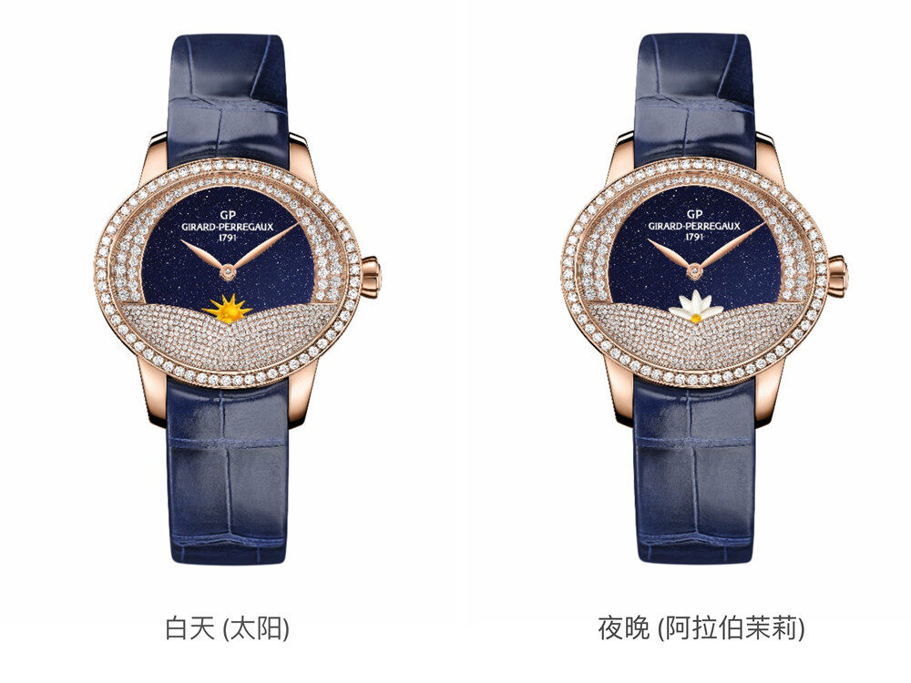 Cat’s Eye猫眼系列Arabian Jasmin腕表采用椭圆形玫瑰金表壳,镶嵌62 颗钻石(重约 0.85 克拉),配以一体式花朵造型抛光表冠。暗色砂金石表盘宛如繁星闪烁的夜空,镶嵌365 颗钻石(重约 0.90 克拉),绽放夺目迷人光芒。金质镌刻日/夜显示盘在太阳和阿拉伯茉造型之间变换,以此代表白天和黑夜,与时针和分针同步,无需进行设置。腕表采用GP芝柏表位于拉绍德封的自有工厂精心打造机械自动上弦GP03300-1051机芯,由218个零件组成,配有46小时的动力储存。透过蓝宝石水晶玻璃表底盖,可看到机芯的自动摆陀镌刻“GP”字样的图案,形成了如同织锦一般的装饰效果,令这款珠宝腕表更显优雅、细腻气质。