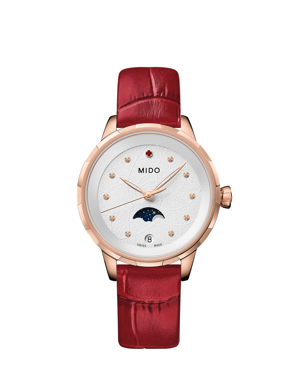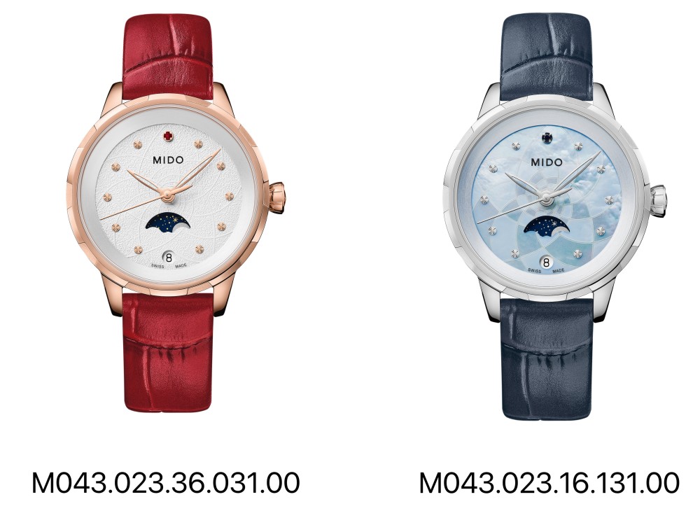 花淅系列月相腕表采用银色表盘,并首次搭载月相显示功能。宛如深蓝夜空中,繁星簇拥下的一轮皎月,银色表盘饰以珍贵红宝石、玫瑰金色表针及刻度,深红色轧鳄鱼纹真皮表带搭配玫瑰金色表壳,共同构成花淅系列女士月相腕表的绰约风姿。借此作品,瑞士美度表向全世界的魅力女性致意,诚挚赞颂她们的澎湃热情与丰沛情感。