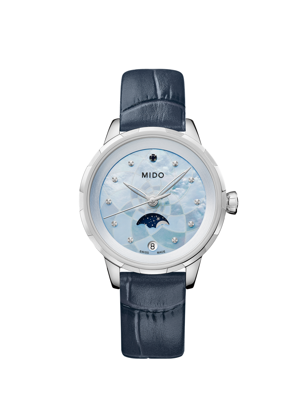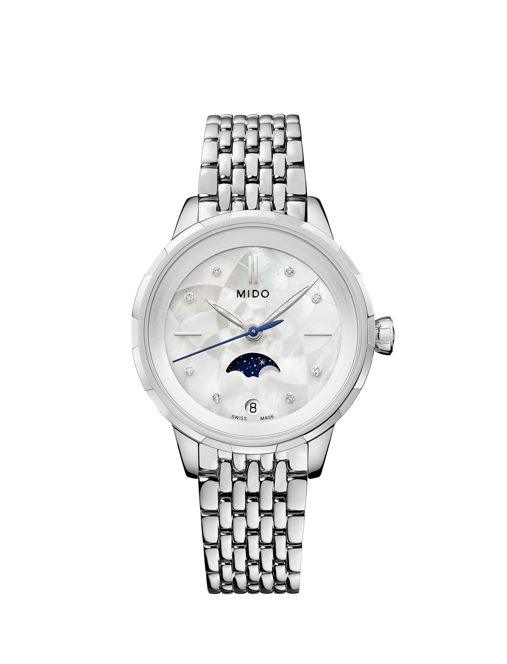 表盘 白色珍珠贝母表盘,抛光不锈钢刻度,8颗真钻作为刻度装饰,日期窗及月相指示器位于6点钟位置。
