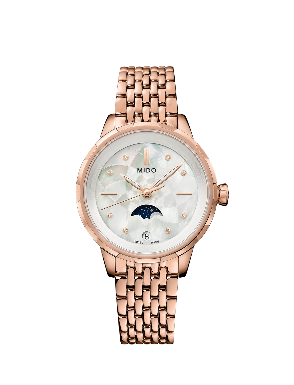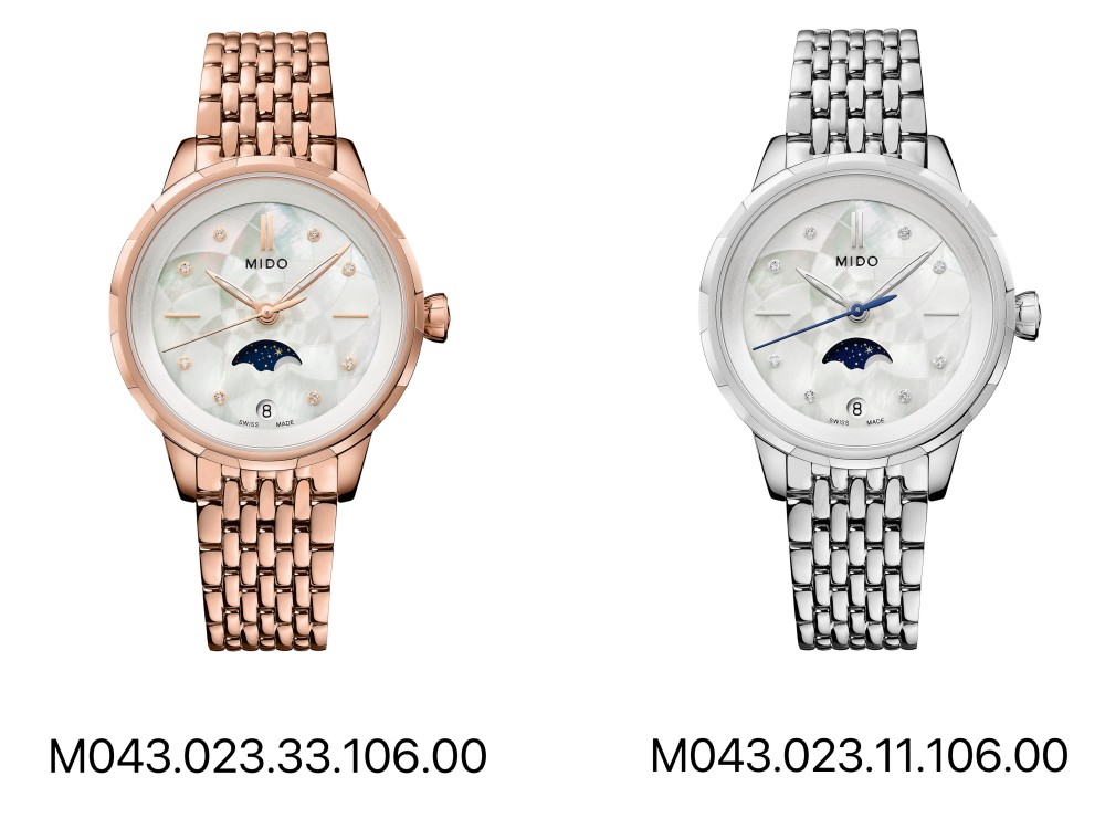 表盘 白色珍珠贝母表盘,PVD镀玫瑰金不锈钢刻度,8颗真钻作为刻度装饰,日期窗及月相指示器位于6点钟位置。
