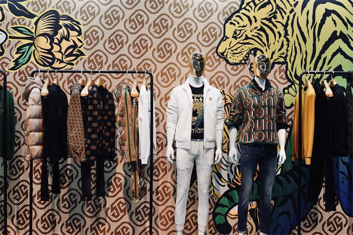 除了注重客户体验,现场服装陈列搭配及展馆搭建也很有讲究。展厅内,第三代OT原创图案与前Gucci设计师Paola Smania的“虎嗅蔷薇”联名印花,交相辉映,彰显着欧度品牌的风格与调性。墙面上老花、猛虎、花卉几大元素浑然天成,带来强烈的视觉艺术美感。左侧墙面还展出了《欧度与清华大学艺术与科学研究中心色彩研究所》有关中国男装色彩研究的合作报告。
