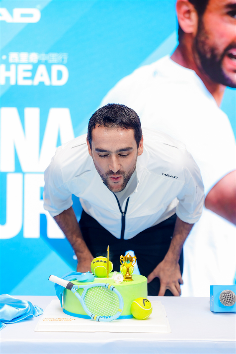 HEAD服饰大中华区总经理包晓代表品牌为西里奇献上网球主题定制蛋糕,延续了疫情之前西里奇中国行的庆生传统。现场西里奇粉丝也为他送上精美定制拼图,与西里奇一同庆祝三十五岁的生日。