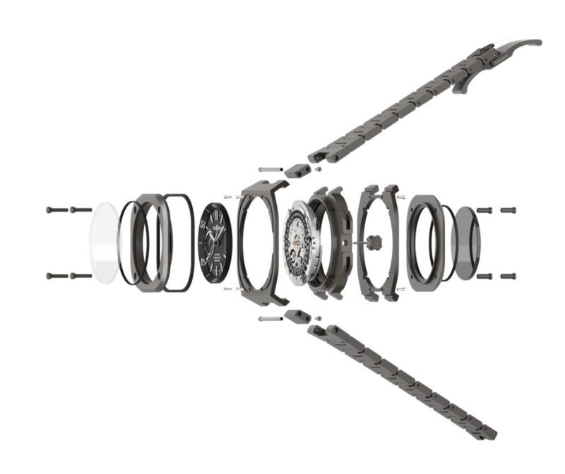 BR-X5的表壳由多个部件组成,纯美线条衬托前卫意念及轻巧强韧的特质。41毫米钛金属表壳更轻更舒适,并保护着自制机芯,两块夹板镶方形表圈及水晶玻璃镜面,形成表壳的面及底,这多层式结构由四颗螺丝贯穿镶密。表壳以2级钛金属制作,有一望而知的灰色调,微喷砂打磨造出不反光哑面金属质感,凸显表款的独特设计。