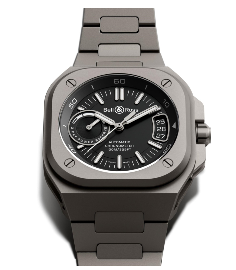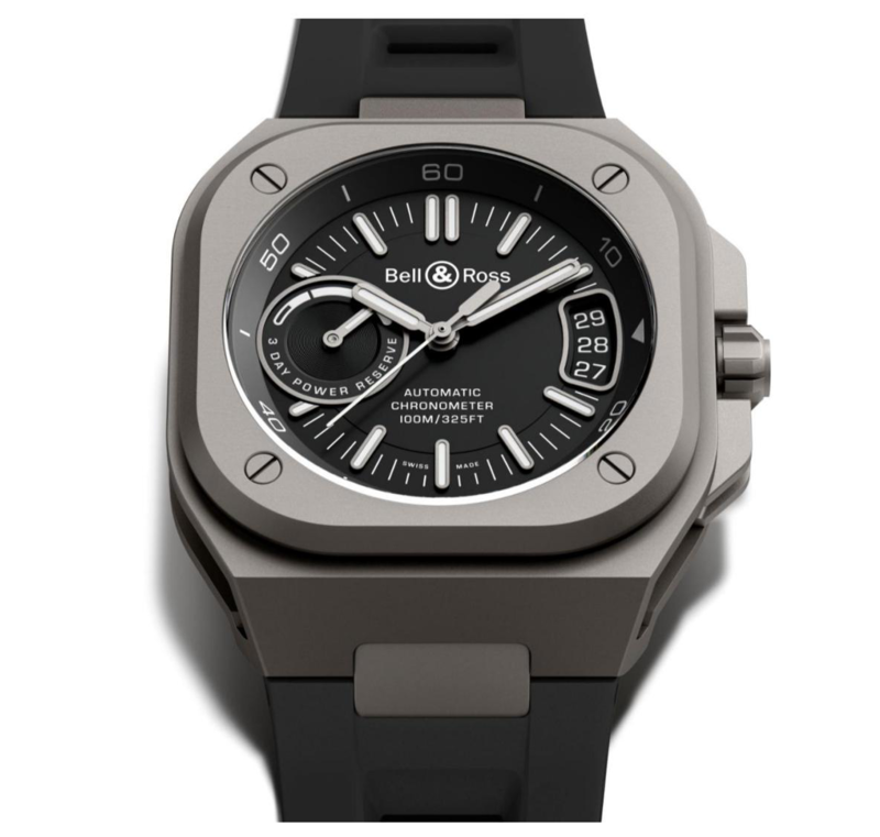 BR-X5系列代表Bell & Ross兼容独特风格及卓越性能的新里程,品牌创意总监兼联合创办人Bruno Belamich强调:「BR-X5装配品牌自制机芯,设计精巧严密,是品牌时计风格及制表技术新一代经典之作。」Bell & Ross一向重视时计功能,这新作的表盘布局及时标清楚易读,3时位置设大日历,9时位置为动力储备显示,时标与时针及分针经SLN X1白色夜光涂层处理,无论日夜皆清楚显示。边缘斜面有分钟刻度标记。