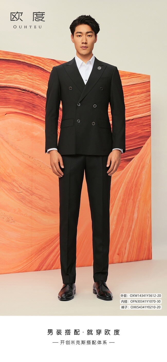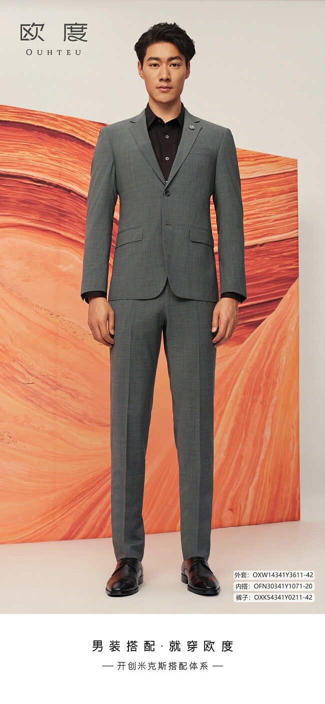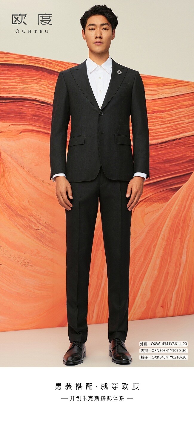 在色彩设计上,欧度2024新款平驳领单排扣时尚套西依旧是灰黑两色,灰色清冷贵气,黑色沉雅庄重。衣身面料的触感细腻柔软,强调舒适轻松的穿着体验;剪裁工艺依旧精细,采用修身版型来挺拔身形,优化整体肩线。在搭配上延续了精致调性,灰色套西搭配黑衬衫,充满从容自在的意蕴气息;黑色套西选择了白衬衫,干净自然,经典大气,演绎出正式利落、亲和从容的造型效果,极具新郎的个人品位和绅士风度。