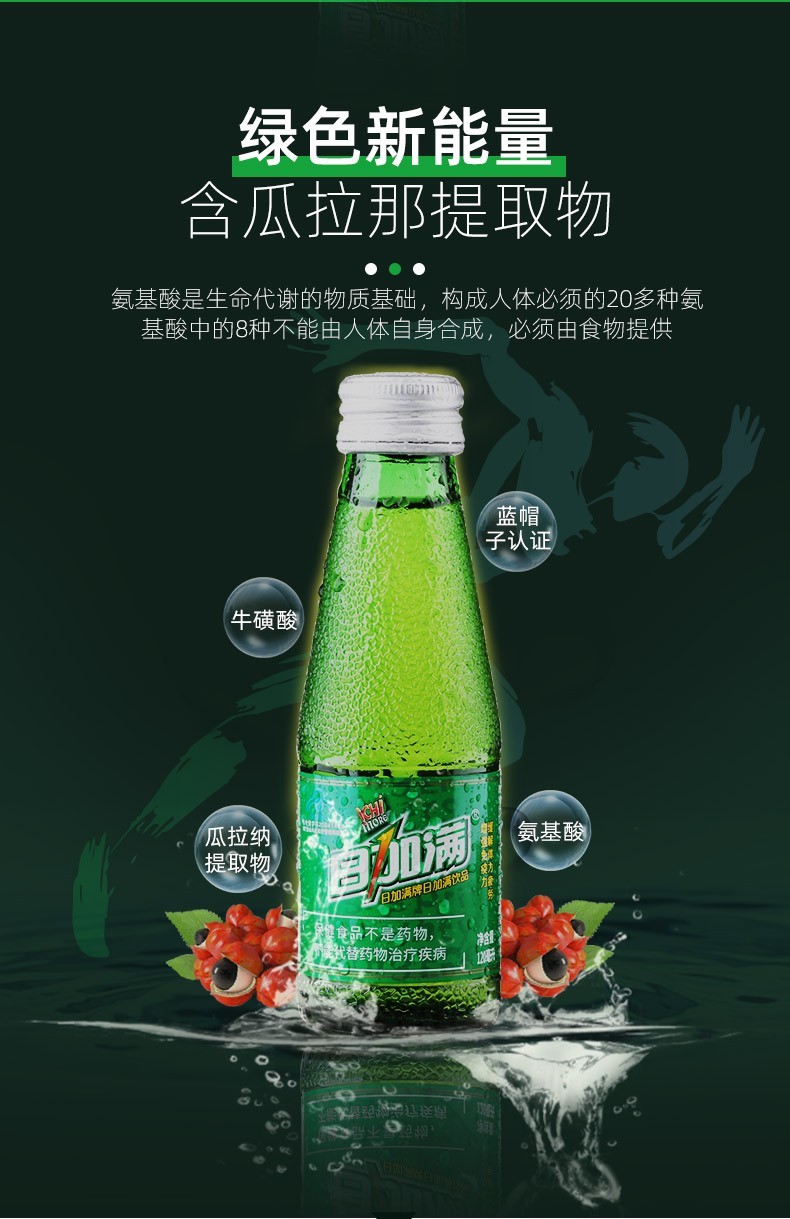 小绿瓶含8种人体必需氨基酸、巴西活力果“瓜拉那”提取物、牛磺酸等,各种营养素科学均衡配比,可缓解体力疲劳、增强免疫力,已获国家食药监“蓝帽子”认证!