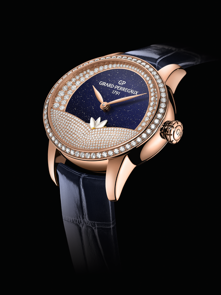 Cat’s Eye猫眼系列Arabian Jasmin腕表采用椭圆形玫瑰金表壳,镶嵌62 颗钻石(重约 0.85 克拉),配以一体式花朵造型抛光表冠。暗色砂金石表盘宛如繁星闪烁的夜空,镶嵌365 颗钻石(重约 0.90 克拉),绽放夺目迷人光芒。金质镌刻日/夜显示盘在太阳和阿拉伯茉造型之间变换,以此代表白天和黑夜,与时针和分针同步,无需进行设置。腕表采用GP芝柏表位于拉绍德封的自有工厂精心打造机械自动上弦GP03300-1051机芯,由218个零件组成,配有46小时的动力储存。透过蓝宝石水晶玻璃表底盖,可看到机芯的自动摆陀镌刻“GP”字样的图案,形成了如同织锦一般的装饰效果,令这款珠宝腕表更显优雅、细腻气质。